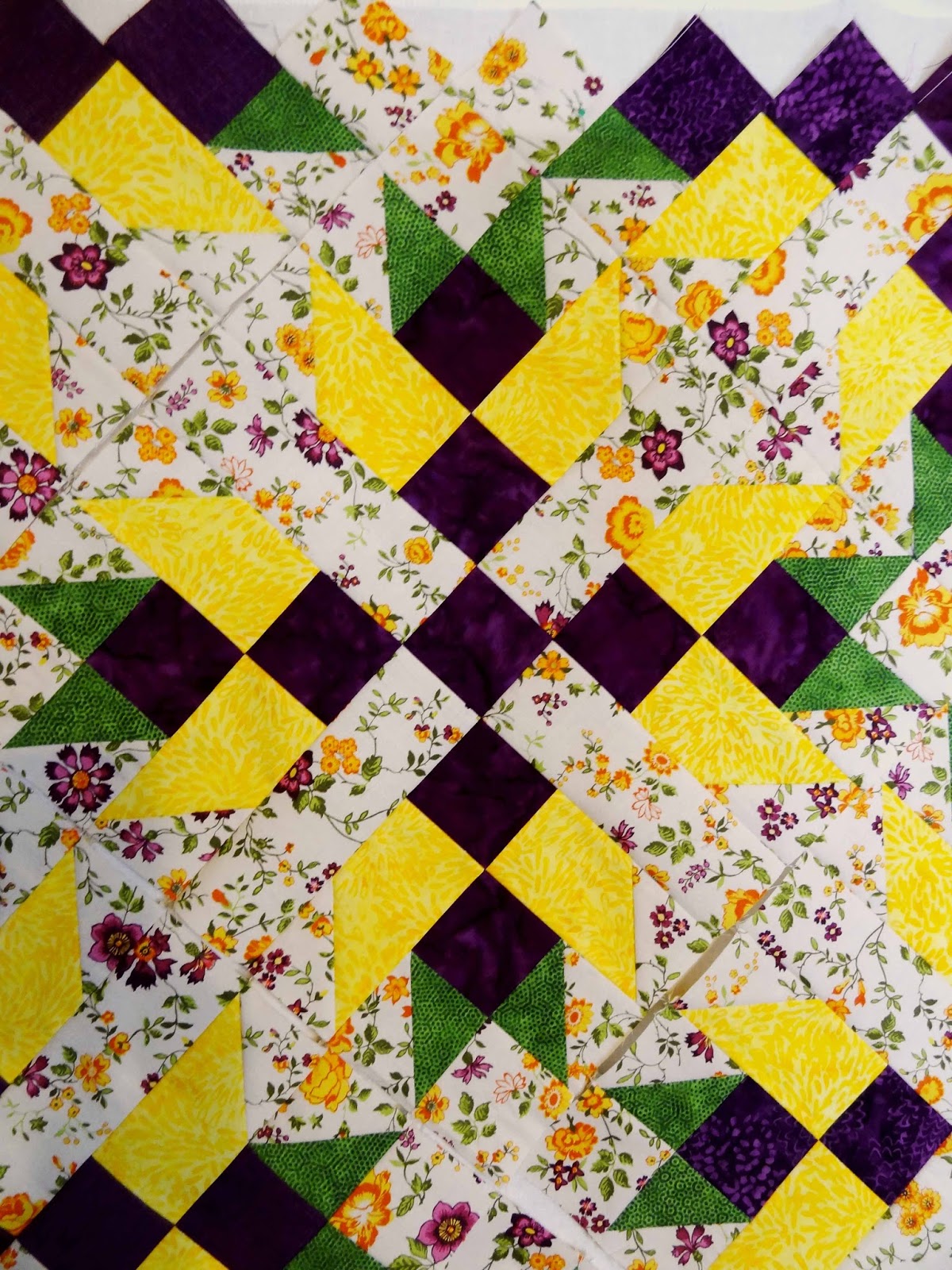 I really like your yellow, purple, and green together. Those are colors I never would have thought to put together, but they look great in your blocks. And as usual, I like your version of Bonnie Hunter's mystery best. Those star blocks look complicated, but I love the result.