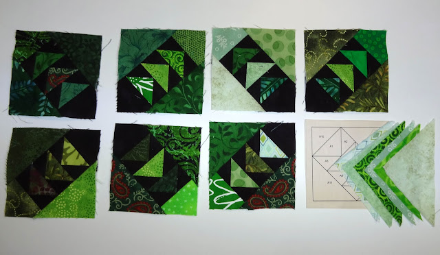 I've got the fabrics picked out for the 8th green block. These little blocks don't take long, but they can't be chain pieced because of the paper piecing part, not all the seams go out to the edge of the block.